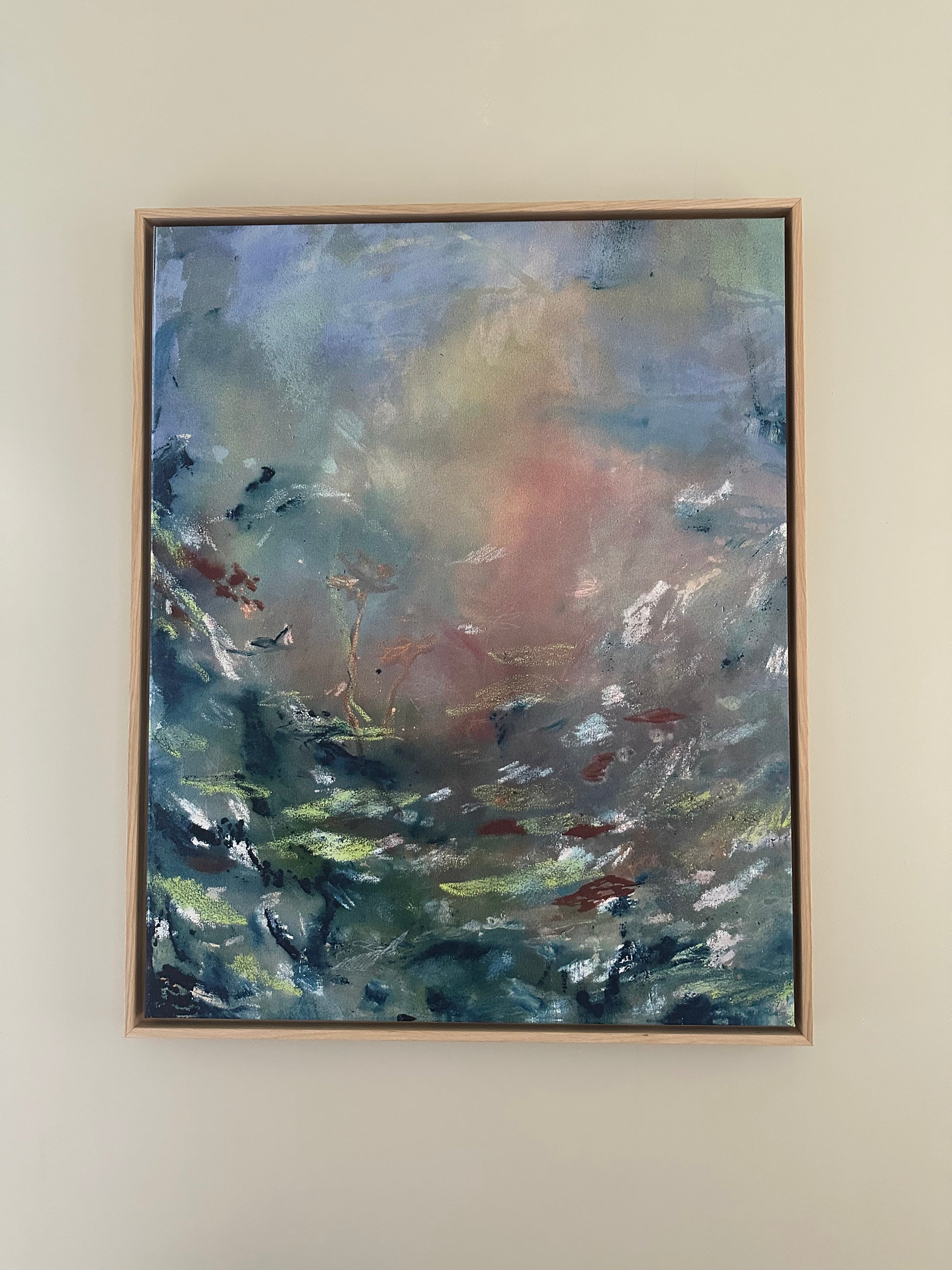 This dreamy abstract piece captures the essence of a quiet moment beneath the water's surface. Soft, blended pigments evoke the feeling of light filtering through rippling water, while layered textures and painterly gestures hint at floating lily pads, stems, and fleeting reflections. The composition balances calmness with movement, inviting the viewer into a fluid, almost meditative state. "Lumpeet" is a visual poem — a contemplation of nature, depth, and emotion.